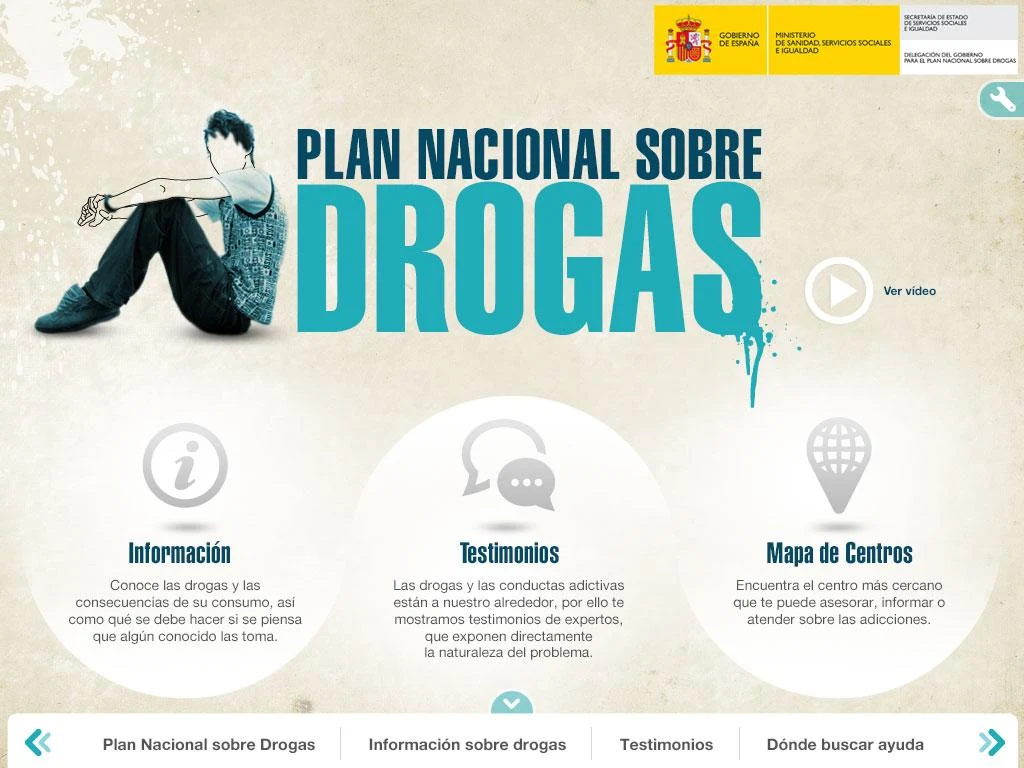 - Para los profesionales ofrece información relacionada con el Plan Nacional sobre Drogas incluyendo: la Estrategia Nacional, el Plan de Acción, encuestas e indicadores del Observatorio Español sobre Drogas.